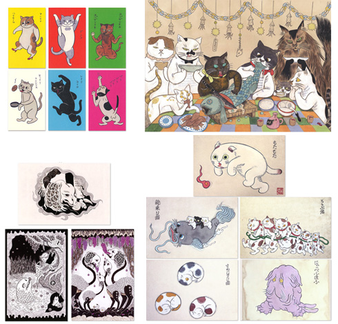 石黒亜矢子「百猫夜行絵巻」シリーズから「鯰乗り猫」「ろうぷ猫」「すねこすり猫」「にゃっぺふほふ」「もたもた」5種がポストカードになりました。