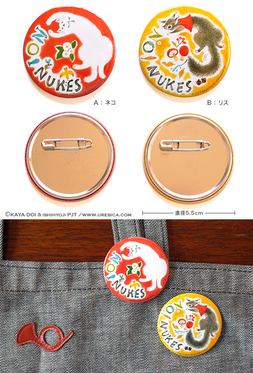 ![]() | 商品番号:NN001-A(ネコ) NN001-B(リス) 商品名:NO!NUKES 缶バッジ(どいかや)