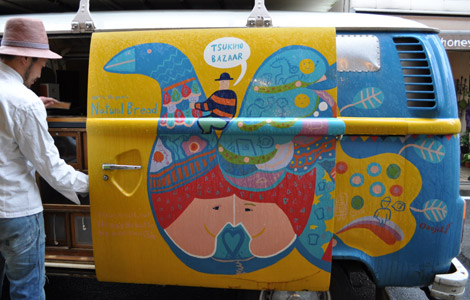 ツキモバザール店主、もっちゃん。この日は朝2時起きてパンを作り、埼玉から4時間かけて経堂まで来てくれました。そうして日暮れ前にはツキモ号ともさようなら。おいしいパンをありがとう!!