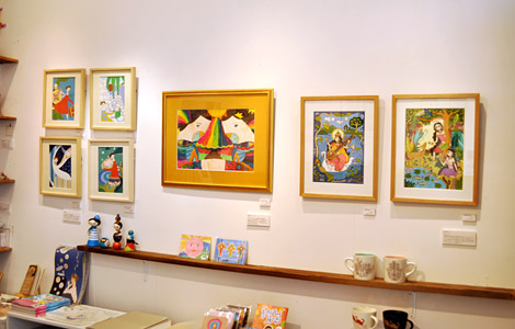奥から、大野舞さんの「ぼうけんのびんづめ」シリーズから4点と旅に連れて行くという人形たちも展示しています(こちら展示のみ)。続いて、Boojilさんの「RAINBOW TREE 」、若山ゆりこさんのインドガールズ!新著『スウィート・モロッコ』も入荷しました。