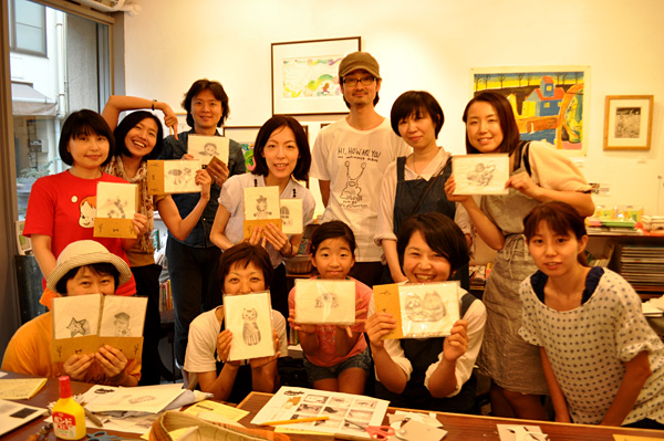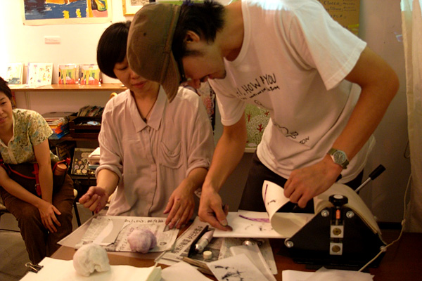 第一部はタダジュンさんとさかたきよこさんによる紙版画ワークショップです。紙版画の作り方、行程はタダジュンさんのブログをご覧いただくとして、皆さんの制作風景をどうぞ。