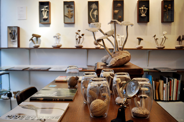 フェルトと布でできた架空の絲森(いともり)に生息するキノコや植物たち。