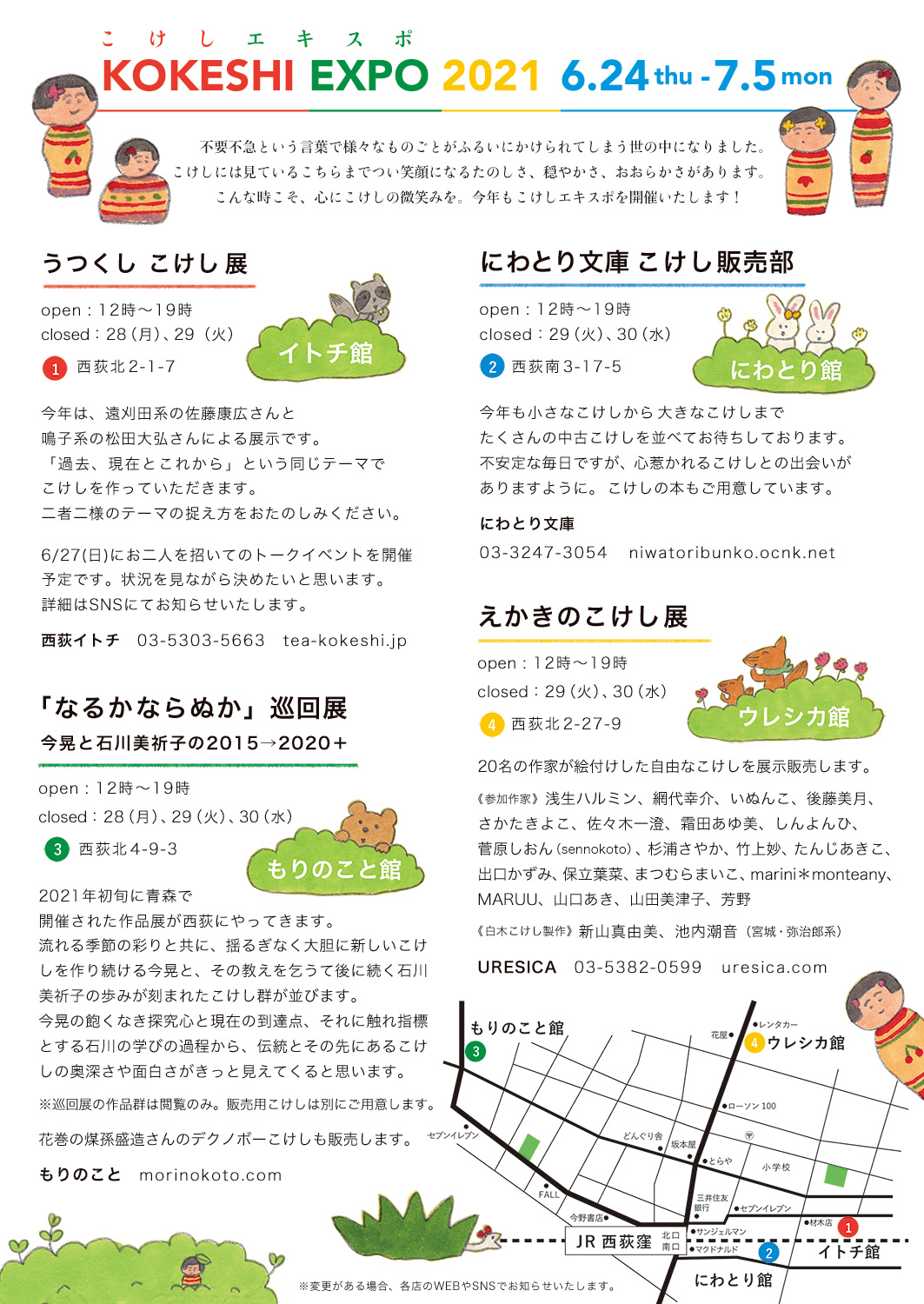 2021年の展覧会・イベント山田美津子「みつこ絵日記」展 2021![]() 山田美津子「みつこ絵日記」展 2021 2021年 12月16日(木)〜12月27日(月) *21(火)・22(水)休み open:12時〜19時 自然や生き物、日々の暮らしをユニークな目線で切り取る「みつこ絵日記」 近年の絵日記をズラリと飾り、描き下ろし作品も展示販売します。 展示にあわせ『よりぬき みつこ絵日記2』を発売します。 西荻イトチともりのことで開催する出口かずみさんカレンダー展「KOBITO journey」 とのコラボ企画もありますよ。 3店を巡ってスタンプを集めよう。詳しくは各店のSNSを要チェックです! 山田美津子 Mitsuko Yamada イラストレーター・絵本作家 1973年滋賀県生まれ 滋賀県在住 著書に『かぜ かぜ かぜ』(こぐま社)『カーたろうとこけしっぺ』『ぼくんちのおふろ』(理論社)『お母さん、だいじょうぶ?』(大和書房)『かいじゅうのさんぽ』『よりぬき みつこ絵日記1』(URESICA)がある。 mitsuko-enikki.net ねこ100テン![]() 「ねこ100テン」 2021年 11月25日(木)〜12月6日(月) *30(火)・1(水)休み open:12時〜19時 50名のアーティストが描く、ねこ2点。ねこ100点を展示販売します。(*DM絵と一部作品は非売です) 展示に合わせ、出展作品を掲載した『ねこ100テン ポストカードブック』を出版いたします。 《参加作家》 網代幸介、石黒亜矢子、伊津野果地、いぬんこ、植田真、大山美鈴、おくはらゆめ、片岡まみこ、片桐水面、きくちちき、北澤平祐、くまあやこ、こみねゆら、坂崎千春、さかたきよこ、坂本千明、佐久間薫、さとうゆうすけ、庄野ナホコ、高橋和枝、竹上妙、嶽まいこ、タダジュン、多田玲子、たんじあきこ、丹地陽子、ちえちひろ、Cimi Cat Painter、出口かずみ、どいかや、とりごえまり、猫野ぺすか、秦直也、樋口佳絵、ヒグチユウコ、深瀬優子、布川愛子、PEIACO、牧野千穂、町田尚子、松田奈那子、松成真理子、marini*monteany、MARUU、水沢そら、ミロコマチコ、柳本史、山田美津子、山福朱実、芳野(50音順) *DM絵:どいかや(2010年) 作品とポストカードブックの売上より10%を動物保護活動のための寄付といたします。 pet-ikumae.com 丹地陽子 作品集 出版記念展「続・読書の愉しみ」![]() 丹地陽子 作品集 出版記念展「続・読書の愉しみ」 2021年 11月4日(木)〜11月15日(月) *9(火)・10(水)休み open:12時〜19時 『丹地陽子作品集』(PIE International)発売を記念して、著者サイン本の販売と、描き下ろし作品の展示販売をいたします。 丹地陽子 Yoko Tanji twitter@yokotanji instagram@yokotanji 網代幸介 個展「Labyrinth」![]() 網代幸介 個展「Labyrinth」 同時開催:『てがみがきたな きしししし』絵本原画展 2021年 10月14日(木)〜10月25日(月) *19(火)・20(水)休み open:12時〜19時 網代幸介、新作の絵を展示販売いたします。 絵本『てがみがきたな きしししし』原画展を同時開催。 網代幸介 Kosuke Ajiro 1980年生まれ。東京在住の画家。 これまで国内外の展示で作品を発表し、平面、立体、アニメーションなど様々な方法で物語のある空想世界を表現する。絵本作品に『サーベルふじん』(小学館)、『てがみがきたな きしししし』(ミシマ社)がある。 kosukeajiro.com たんじあきこ 個展「ちいさなものたちは」![]() たんじあきこ 個展「ちいさなものたちは」 2021年 9月30日(木)〜10月11日(月) *5(火)・6(水)休み open:12時〜19時 すぐそこにいるかれらは トテチテ トテチテと 内に外にと思いを巡らせている いつでも ちいさなものたちは 小さな陶粘土作品と絵の展示販売をいたします。 たんじあきこ Akiko Tanji 絵本作家、イラストレーター。東京都在住。 著書に「チコちゃんこまったこまったね」(ほるぷ出版)「おでんわ もしもし しましまちゃん」(くもん出版)など。挿絵に「ぷうちゃんのちいさいマル」(東直子・文/岩崎書店)「そろそろ そろーり」「さんどいっちにー」(ほるぷ出版)「ゆかいなちびっこモンスター」(風濤社)「いじわるちゃん」(岩崎書店)など。 akiko-tanji.tumblr.com|twitter|instagram ![]() 加藤休ミ 個展「休ミの森」![]() 加藤休ミ 個展「休ミの森」 2021年 9月9日(木)〜20日(月) *14(火)・15(水)休み open:12時〜19時 クレヨンとクレパスで描く加藤休ミの五感を刺激する絵画作品展。 オリジナル作品の展示販売と、絵本『さかなをたべたあとのほね』(福音館書店)原画の展示をいたします。