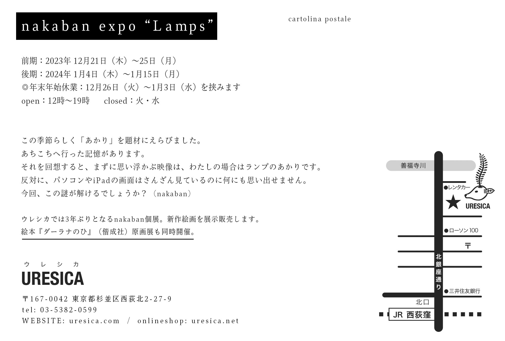 2023年の展覧会・イベントnakaban 個展「Lamps」![]() nakaban 個展「Lamps」 前期:2023年 12月21日(木)〜25日(月) 後期:2024年 1月4日(木)〜1月15日(月) ◎年末年始休業:12月26日(火)〜1月3日(水)を挟みます open:12時〜19時 closed:火・水 この季節らしく「あかり」を題材にえらびました。 あちこちへ行った記憶があります。 それを回想すると、まずに思い浮かぶ映像は、わたしの場合はランプのあかりです。 反対に、パソコンやiPadの画面はさんざん見ているのに何にも思い出せません。 今回、この謎が解けるでしょうか? ウレシカでは3年ぶりとなるnakaban個展。新作絵画を展示販売します。 絵本『ダーラナのひ』(偕成社)原画展も同時開催。 nakaban ナカバン 1974年 広島県生まれ。画家。 旅の記憶を主題とし、絵の中を旅するように風景を描き続けている。また音楽家のトウヤマタケオと「ランテルナムジカ」を結成し各地でライブを行う。2013年には新潮社の「とんぼの本」のロゴマークを制作。近年は絵本を数多く発表。主な作品に「よるのむこう」(白泉社)「ころころオレンジのおさんぽ」(イースト・プレス)「みずいろのぞう」(ほるぷ出版)「ぞうのびっくりパンやさん」(大日本図書)「うみべのいす」(佼成出版社)「ダーラナのひ」(偕成社)他多数。 nakaban.com ![]() くまあやこ 個展「うたう星庭」![]() くまあやこ 個展「うたう星庭」 会期:11月23日(木)〜12月11日(月) 1階にて一部延長展示:12月14日(木)〜18日(月) open:12時〜19時 closed:火・水 心に棲むいきものや植物たちのお話を、夢のなかのことを、銅版画や紙版画で描きます。 版画とちいさな陶芸作品もいくつか展示販売します。 くまあやこ Ayako Kuma イラストレーター・版画家 神奈川県生まれ。中央大学独文専攻卒。イラストレーション青山塾ドローイング科、灘本唯人塾で絵を学ぶ。 銅版画や紙版画、絵の具、陶芸などで犬やいきものたちの棲む幻想的な世界を描く。 児童書や絵本の絵も多数手がける。 tis-home.com/ayako-kuma/ ![]() MARUU 個展「もくもく」![]() MARUU 個展「もくもく」 会期:10月26日(木)〜11月13日(月) 1階にて一部延長展示:11月16日(木)〜20日(月) open:12時〜19時 closed:火・水 2013年に自主制作した絵詩集『もくもく』。 あれから10年たった今、絵と文章を追加した新装版をお届けします。 原画の展示とあわせて、小さな額絵も販売します。 ![]() 《MARUU おえかきワークショップ》 「内なるこどもに会いにいく」 ◎ナビゲーター:MARUU ◎開催日時: 1)11月4日(土)10:00〜11:30 2)11月6日(月)10:00〜11:30 *終了しました 大人になってから、評価やジャッジが一切されない場でのびのびと絵を描いたことはありますか? このワークショップを通じて、それぞれの方が素のこどもの頃の自分に、一瞬でも戻れたら最高だなと思っています。 パステル、クレヨン、色鉛筆をつかって、自由に絵を描いて頂きます。 描いた絵を見せながら感想をシェアリングする時間も設けます。 そのため少人数で、お店の営業時間外で行います。 MARUU マルー 多摩美術大学グラフィックデザイン科卒業後、University of the Arts London Camberwell College of Artsにてイラストを学ぶ。書籍の装画、挿絵を多く手がける他、絵本、漫画など活動の幅を広げる。装画に『鳥たち』(吉本ばなな 集英社)、装画と挿絵に『不時着する流星たち』(小川洋子 KADOKAWA)、絵本の絵に『[現代版] 絵本御伽草子 象の草子』(堀江敏幸 講談社)、絵本に『わたしのものよ』(WAVE出版)、漫画に『うさぎのまんが』(祥伝社)、自作絵詩集に『もくもく』など。東京在住。 maruu.illust.jp ![]() 町田尚子個展「隙間の向こう」![]() 町田尚子個展「隙間の向こう」 会期:9月28日(木)〜10月16日(月) open:12時〜19時 closed:火・水 2022年に初の作品集「隙あらば猫」を刊行し、全国巡回展も続く絵本作家で画家の町田尚子。 当ギャラリーでは4年ぶりとなる個展を開催。描きおろし作品を展示販売いたします。 新作絵本『どすこいみいちゃんパンやさん』(ほるぷ出版)原画の一部も展示します。 サイン本とグッズの販売もあります。 《同時期開催》 「隙あらば猫 町田尚子絵本原画展」 会期:9/28(木)〜10/10 (火) 会場:松坂屋上野店 6階催事場 折しも全国巡回中の展覧会が東京にやってきます! 詳細はこちら→ 隙あらば猫 町田尚子絵本原画展(東京展・松坂屋上野店) 町田尚子 Naoko Machida 1968年東京都生まれ。画家、絵本作家。武蔵野美術大学短期大学卒業。絵本作品に『うらしまたろう』(あかね書房)、『マッチうりのしょうじょ』(フレーベル館)、京極夏彦とタッグを組んだ怪談えほん『いるの いないの』『あずきとぎ』(ともに岩崎書店)などがある。猫が主役の絵本に『ネコヅメのよる』(岩崎書店)、『なまえのないねこ』(小峰書店)、『ねことねこ』(こぐま社)、『ねこはるすばん』(ほるぷ出版)など。多くの読者に愛される絵本を描き続けている。「隙あらば猫 町田尚子絵本原画展」が全国巡回中。 naokomachida.wixsite.com ![]() 阿部結『なみのいちにち』原画展+作品展![]() 阿部結『なみのいちにち』原画展+作品展 会期:8