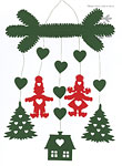 デンマークの小人ニッセがツリーとお家といっしょに揺れています。もみの枝を開いて飾りましょう。